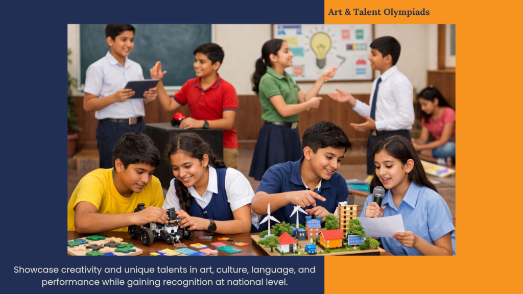 This is a structured nationwide initiative that provides students with a credible platform to showcase their creative, artistic, linguistic, and intellectual abilities. Aligned with the vision of National Education Policy 2020, the Olympiad focuses on nurturing the whole child by encouraging creativity, critical thinking, communication skills, and self‑expression. It complements the school curriculum while giving students opportunities to gain recognition at school, regional, and national levels.